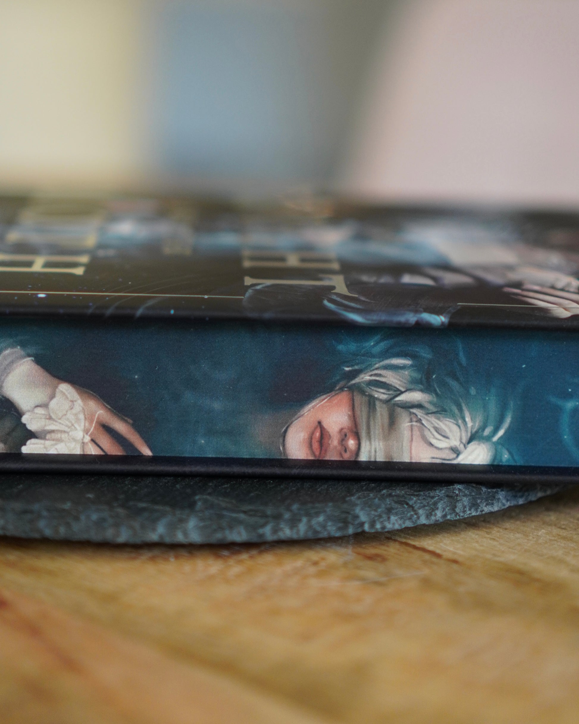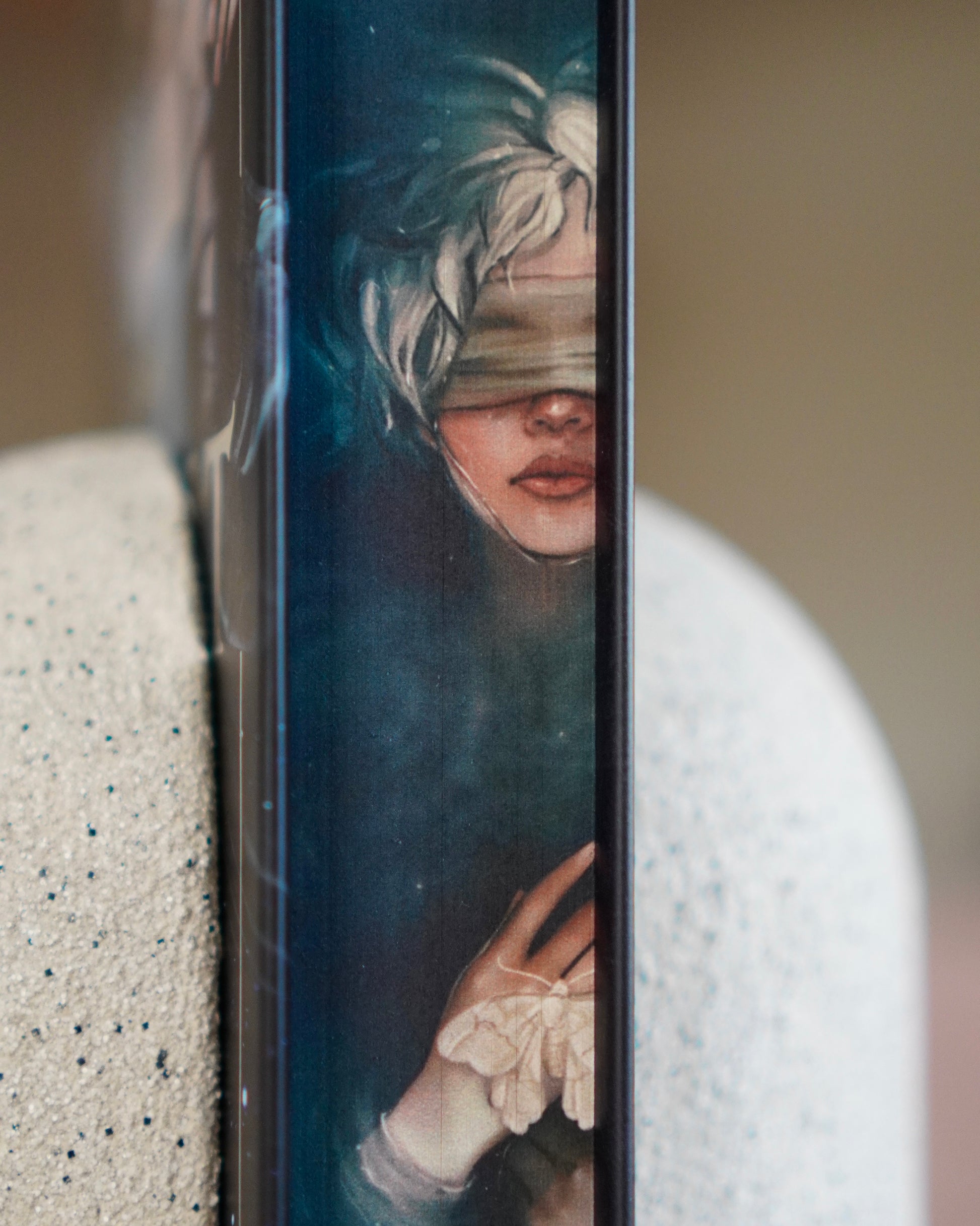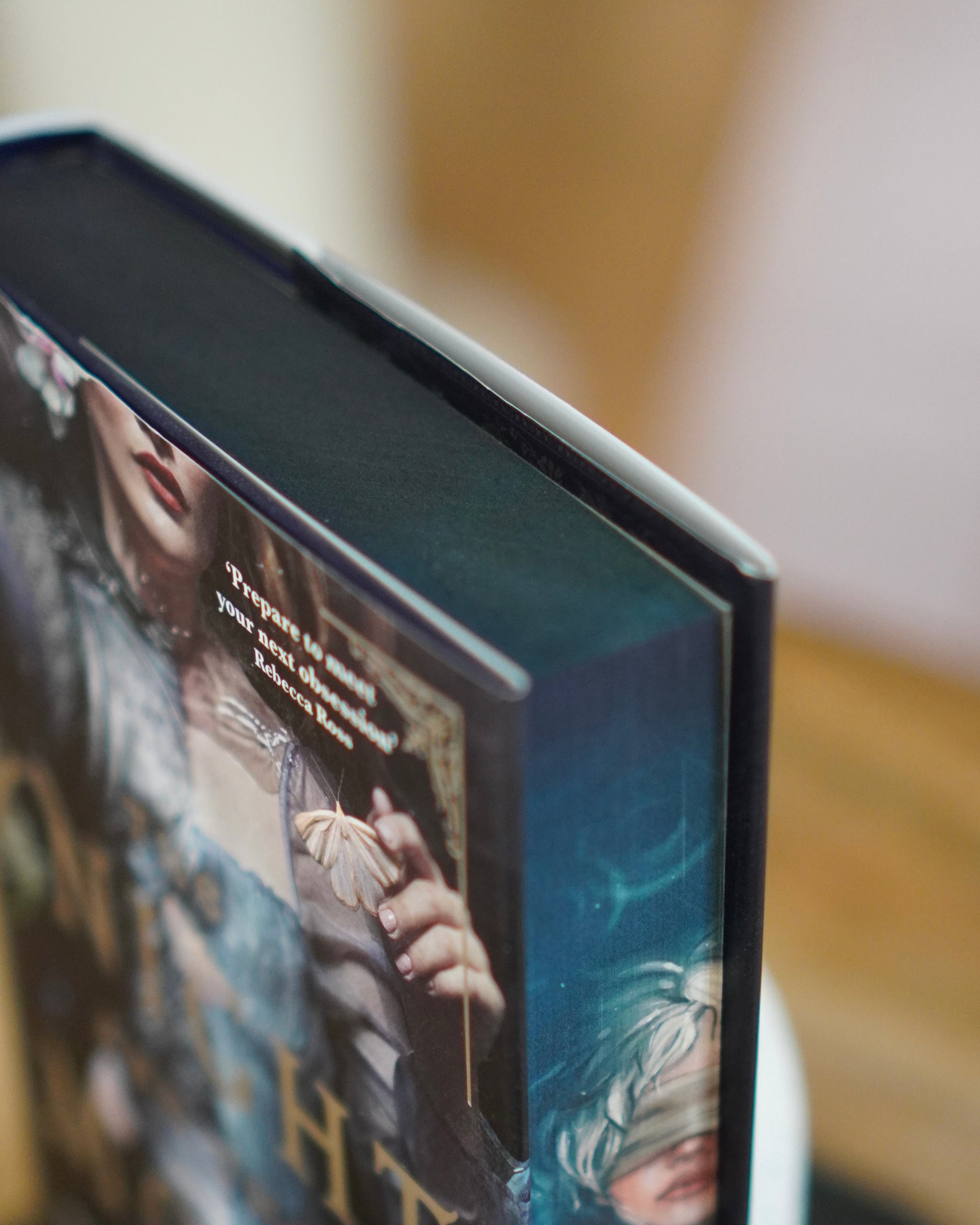 This exclusive copy of The Knight and the Moth by Rachel Gillig features special edge art, digitally painted and printed by me, Hanna Bookpaintings.